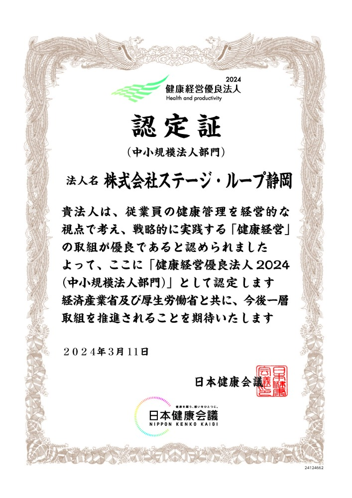 このたび弊社は、経済産業省が認定している「健康経営優良法人認定制度」より、「中小規模法人部門」における「健康経営優良法人2024」に認定されました。